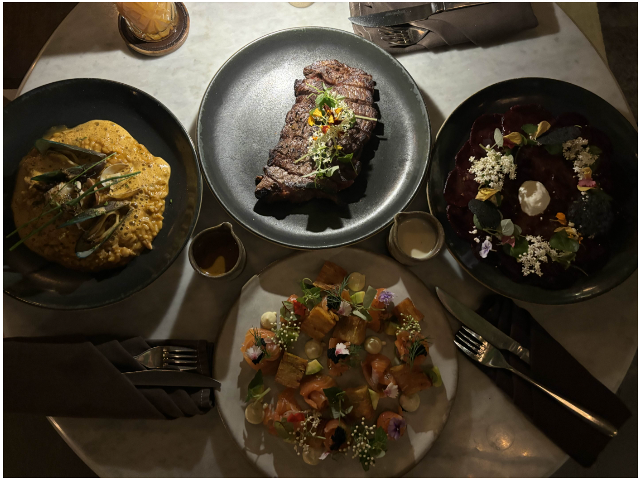 여자 3명이 음식을 총4가지 주문했는데 모든 음식이 다 맛있었습니다. 소고기도 잘 익혀져 나오고 카페레제와 리소토, 연어 플레이트까지 한상 너무 먹기 아까울 정도로 예쁜 테이블입니다. 우즈 테이블은 데이트 코스로도 너무 좋은 것 같아요 커플들이 정말 많이 왔습니다. 넓은 레스토랑에 어두운 분위기에 예쁜 조명들로 분위기를 내는데 정말 한국이랑 많이 다른 분위기의 레스토랑이었습니다. 그리고 얼마나 음식에 신경을 많이 쓰는지도 느낄 수 있었습니다. 특히나 직원들의 서비스와 친절함 때문에 더욱 기분 좋게 음식을 먹을 수 있었습니다.