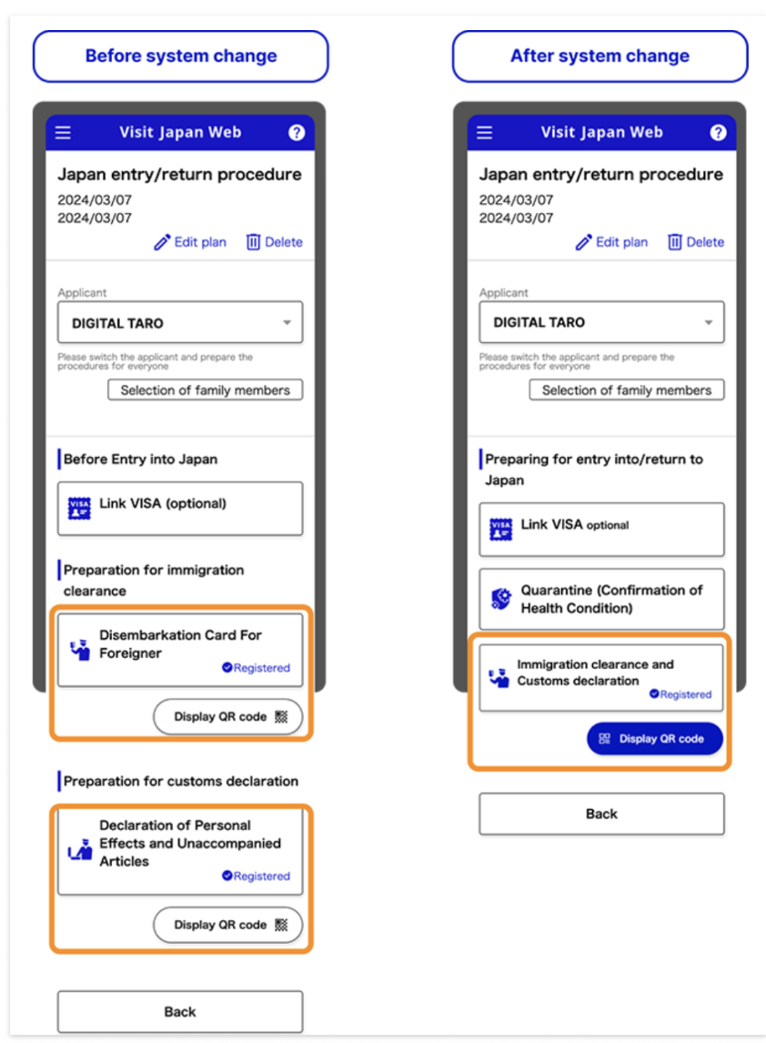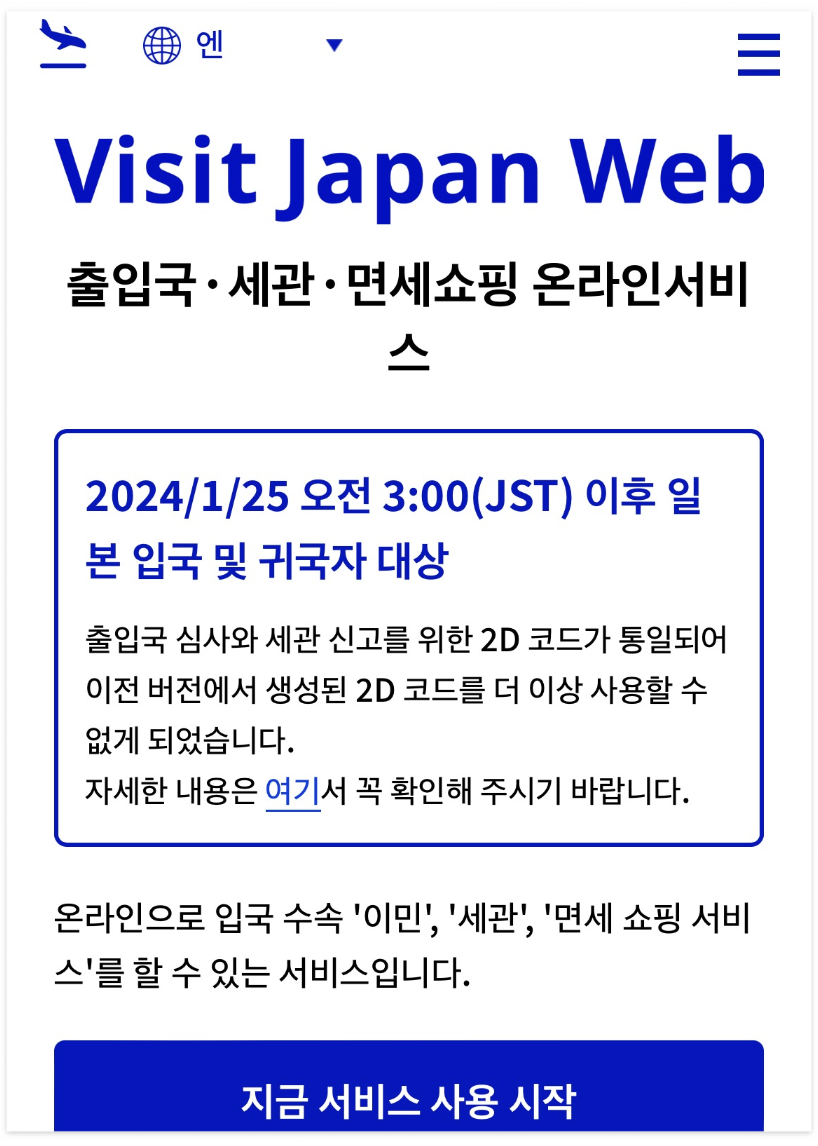 비지트재팬은 입국 심사 시 필요한 양식 중 하나입니다. 일반적으로 여권, 왕복 항공권 예약 정보, 체류 목적에 대한 자세한 계획, 자금 증빙 등이 필요합니다. 최근 24년 1월 25일 새벽 3시 이후로 시스템이 변경이 되었습니다. 기존에는 입국심사와 세관신고 바코드(QR코드) 부분을 따로 진행했었는데 하나로 통합이 되는 내용입니다. 24년 1월 25일 이후 입국하시는 분들은 기준으로 작성된 글이니 이 글을 참고하셔서 순서대로 작성하시면 되겠습니다. 저의경우 일본여행을 1월 25일이후에 예정되어있어서 변경된 시스템대로 작성을 해야했습니다.